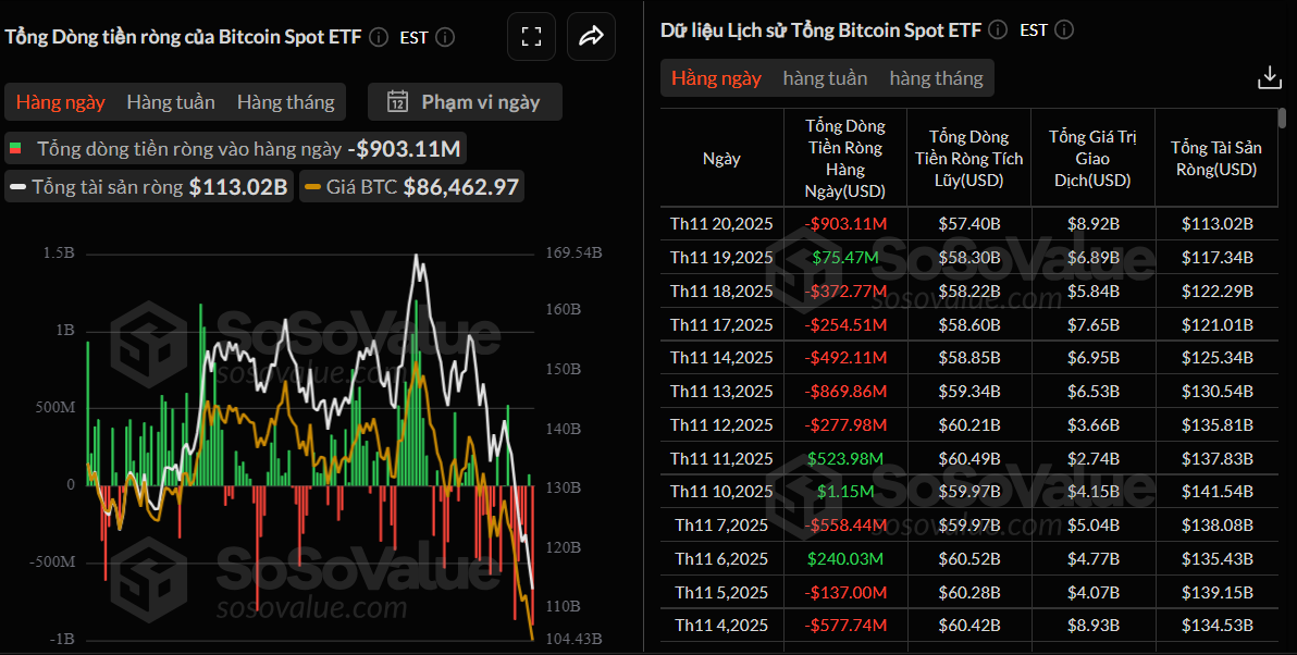 Trong phiên giao dịch ngày 20/11, thị trường ETF tiền mã hóa tiếp tục chứng kiến làn sóng rút vốn mạnh. Các quỹ ETF Bitcoin giao ngay ghi nhận tổng dòng vốn rút lên tới 903 triệu USD, mức cao thứ hai trong lịch sử, cho thấy tâm lý thận trọng đang bao trùm nhà đầu tư trong bối cảnh biến động gia tăng của BTC.