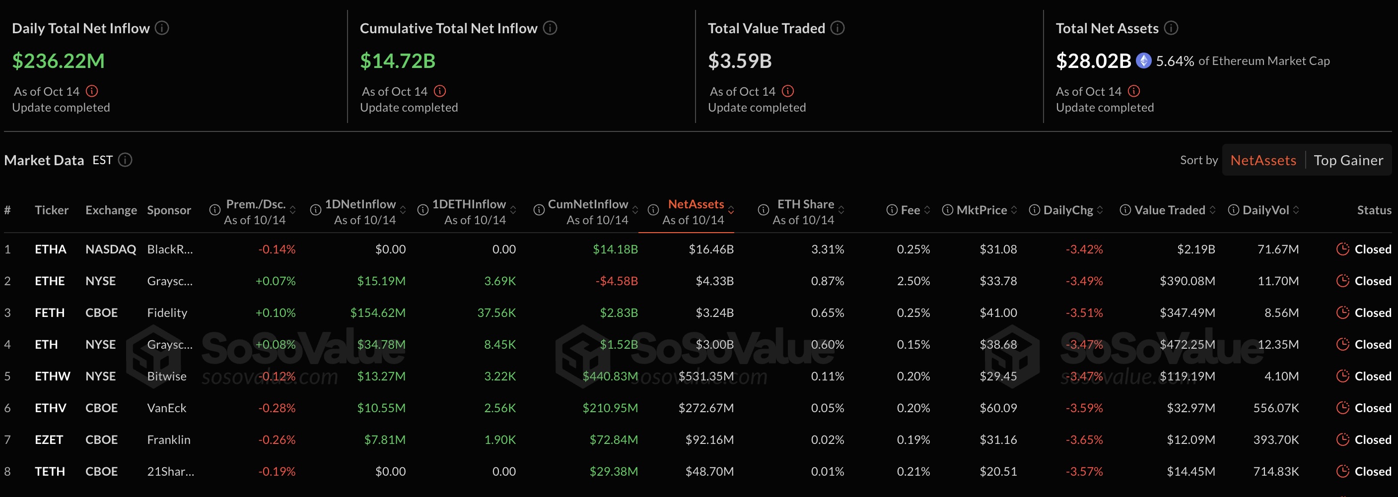 Ở mảng Ethereum, các quỹ ETF giao ngay ghi nhận tổng dòng vốn ròng 236,22 triệu USD, phân bổ trên sáu quỹ. Fidelity FETH tiếp tục dẫn đầu với 154,62 triệu USD, trong khi các quỹ khác của Grayscale, Bitwise, VanEck và Franklin Templeton cũng chứng kiến dòng tiền vào đáng kể.