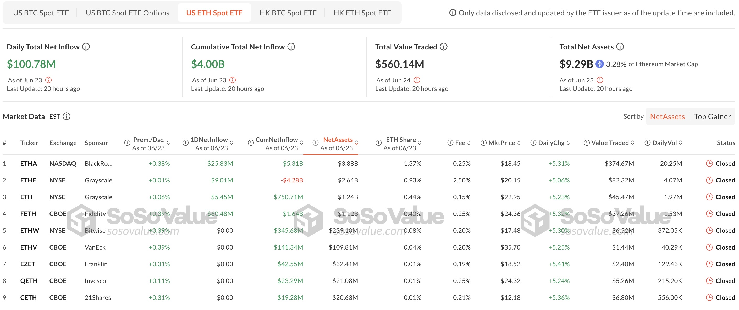 Các quỹ ETF Ethereum giao ngay niêm yết tại Mỹ đã vượt mốc 4 tỷ USD dòng tiền ròng tích lũy vào ngày 23/6, chỉ 11 tháng sau khi chính thức ra mắt thị trường.
