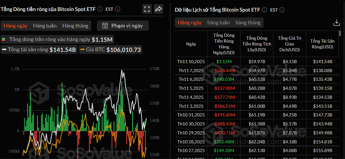 Vào ngày 10 tháng 11 (theo giờ ET), dữ liệu từ SoSoValue cho thấy các quỹ ETF Bitcoin giao ngay tại Mỹ ghi nhận dòng vốn ròng 1,15 triệu USD, trong đó BITB của Bitwise là quỹ duy nhất có dòng vốn vào. Điều này phản ánh niềm tin của nhà đầu tư vào Bitcoin dù các quỹ khác không tăng trưởng.