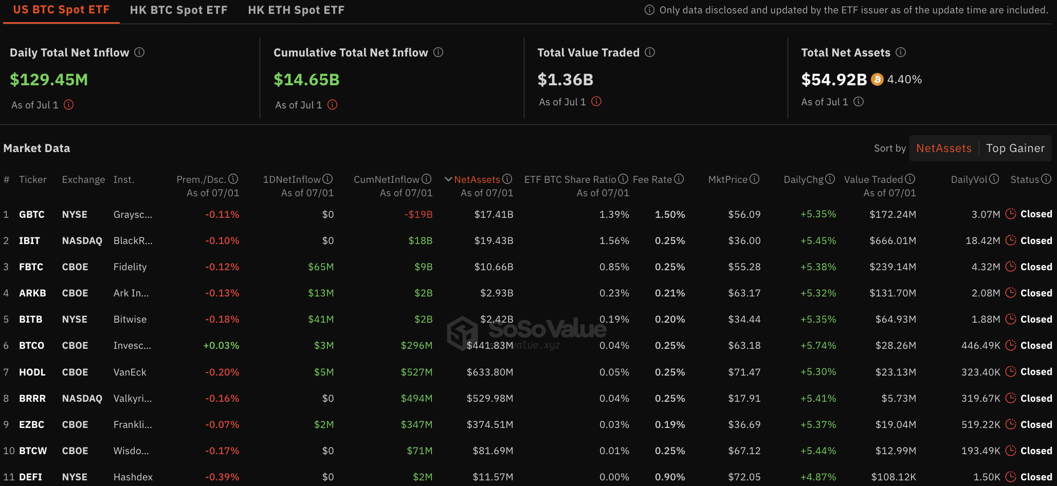 11 quỹ Bitcoin ETF giao ngay của Hoa Kỳ đã chứng kiến tổng dòng vốn ròng hàng ngày là 129,45 triệu đô la vào thứ Hai, đánh dấu ngày thứ năm liên tiếp ghi nhận dòng tiền tích cực và cũng là mức lớn nhất kể từ ngày 7 tháng 6.
