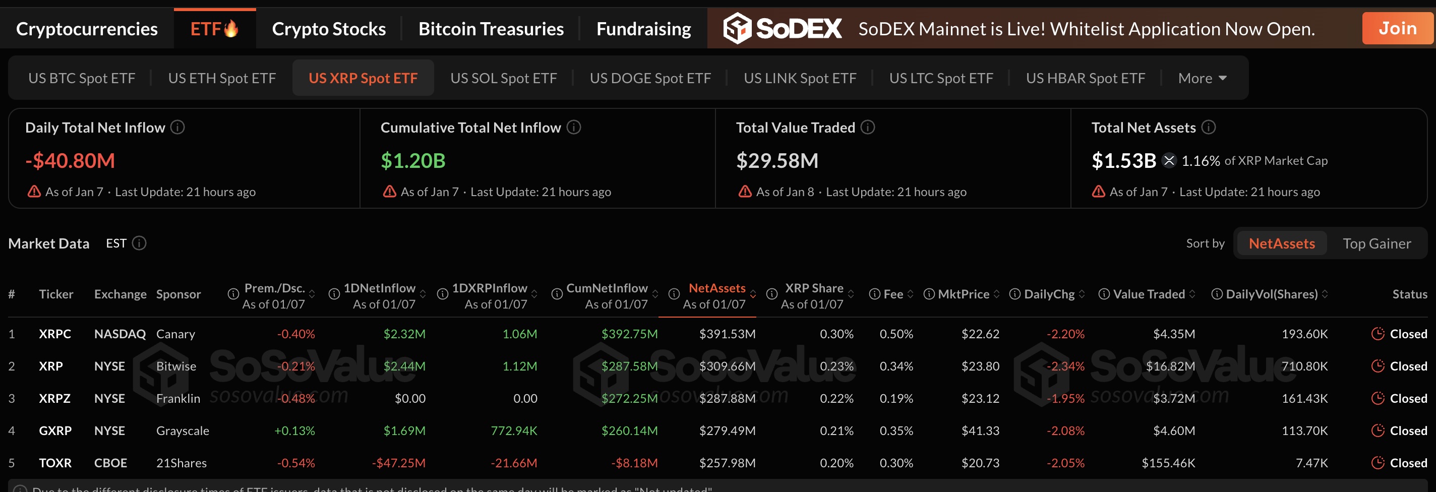 Mặc dù có dòng tiền rút, tổng giá trị giao dịch trong hệ thống ETF XRP vẫn đạt 33,74 triệu USD, cho thấy thị trường vẫn quan tâm nhưng không hoảng loạn. Kể từ giữa tháng 11, tổng dòng tiền vào đạt 1,2 tỷ USD, đưa tổng tài sản ròng lên khoảng 1,53 tỷ USD, chiếm khoảng 1,16% vốn hóa thị trường của XRP.