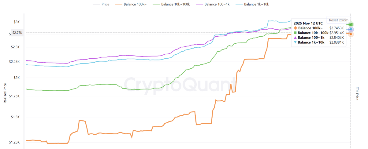 Hiện tại, ETH đang tiến gần đến mức giá vốn trung bình – hay giá thực tế – của nhóm cá voi nắm giữ 10.000–100.000 ETH, quanh vùng 2.900 USD. Việc giá giảm xuống dưới ngưỡng này thường kích hoạt các đợt bán cắt lỗ mạnh từ nhóm nhà đầu tư lớn.