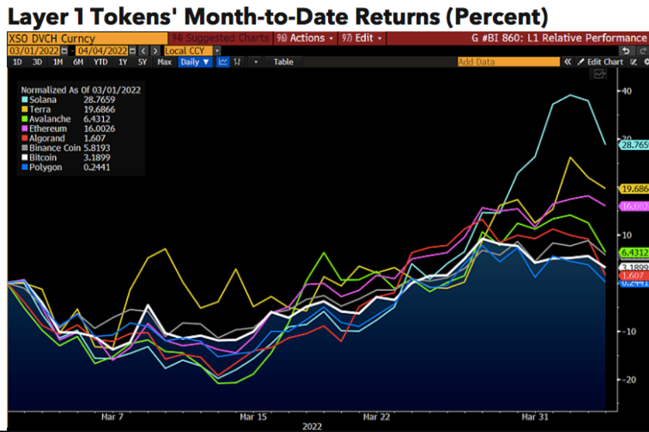 “Các layer 1 như Solana, Terra và Avalanche đã dẫn đầu sự phục hồi của thị trường rộng lớn hơn với lợi nhuận hàng tháng trong tháng 3 cao hơn 1,5-2 lần so với tài sản chuẩn. Cải thiện này là một dấu hiệu lành mạnh cho thấy sự thèm muốn rủi ro đang quay trở lại”.