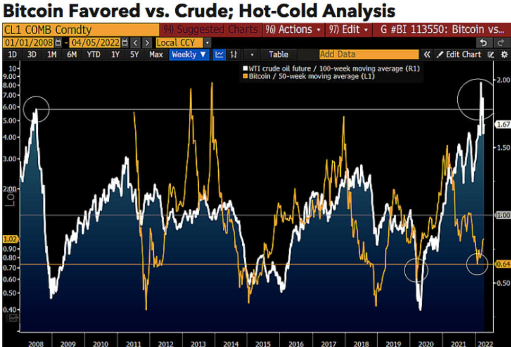Xem cả hai tài sản là hàng hóa, ông cho rằng giá dầu thô tương đối cao so với mức chiết khấu hiện tại của Bitcoin, điều này có nghĩa là giá BTC sẽ tăng khi giá dầu thô quay trở lại mức trung bình.