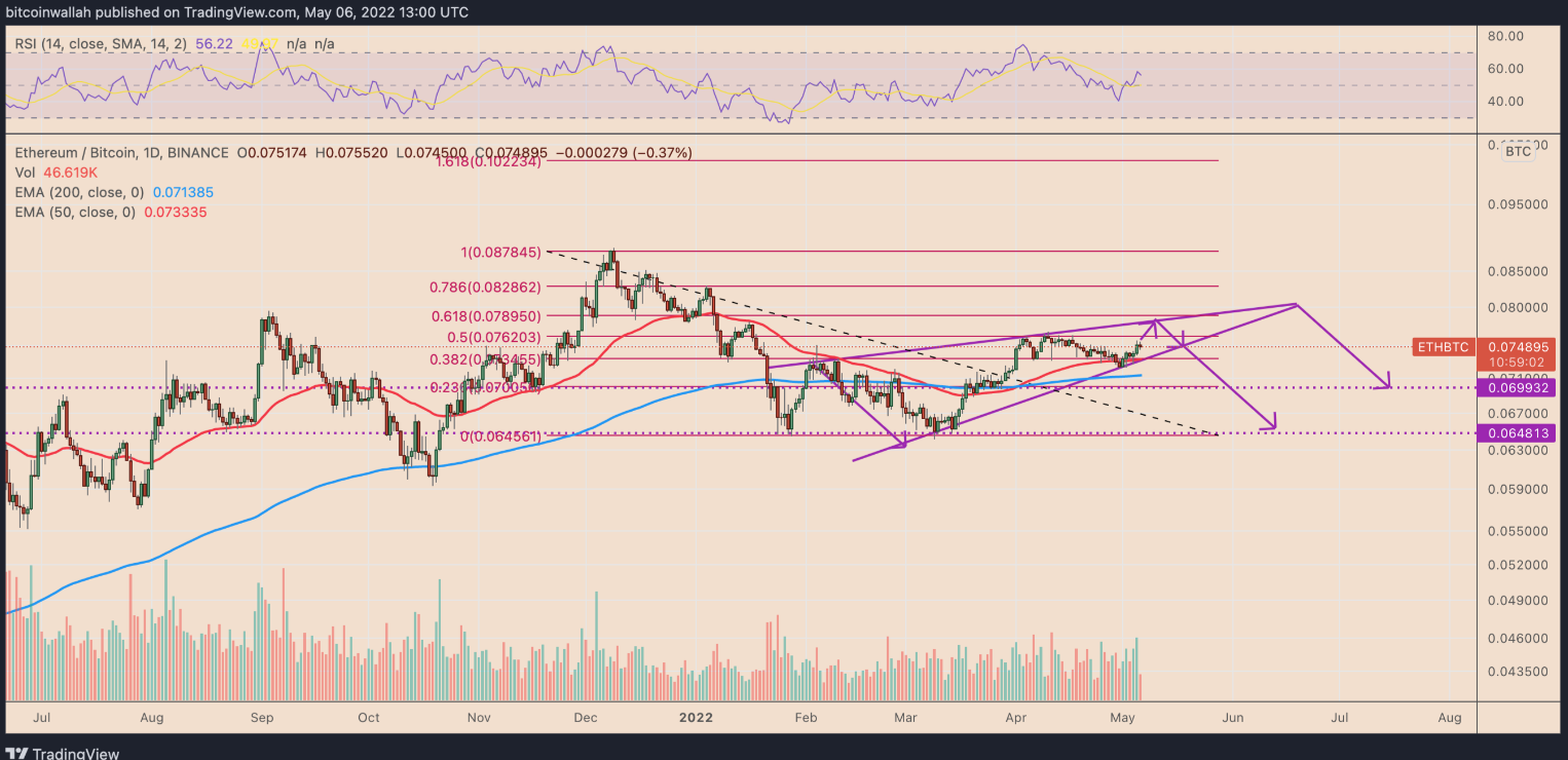 Các chỉ số kỹ thuật cho thấy ETH/BTC có thể tăng trưởng hơn nữa vào tháng 5 nhưng có nguy cơ điều chỉnh trong dài hạn vì nó đang giao dịch bên trong một cái nêm tăng.