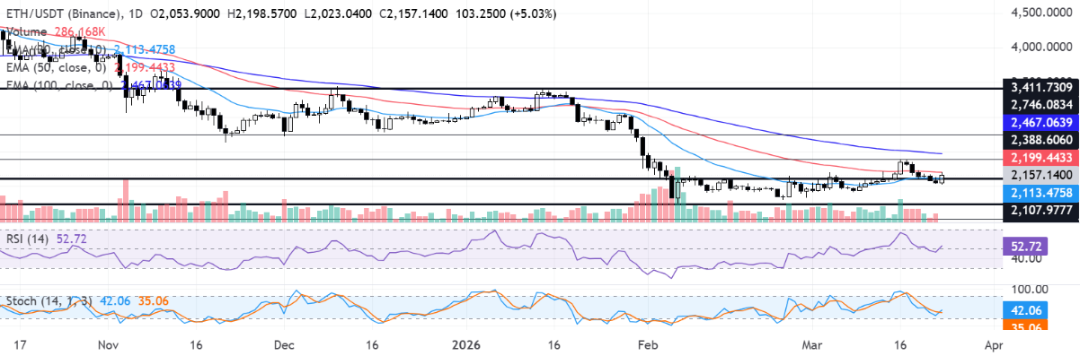 Trên biểu đồ ngày, ETH hiện dao động quanh mốc 2.164 USD. Xu hướng ngắn hạn đang nghiêng nhẹ về tích cực khi giá duy trì trên đường EMA 20 ngày tại vùng 2.115 USD, cho thấy lực mua vẫn đang bảo vệ khu vực hỗ trợ quan trọng. Tuy vậy, việc giá vẫn nằm dưới đường EMA 50 và EMA 100 ngày cho thấy đà phục hồi tổng thể chưa thực sự được xác nhận.