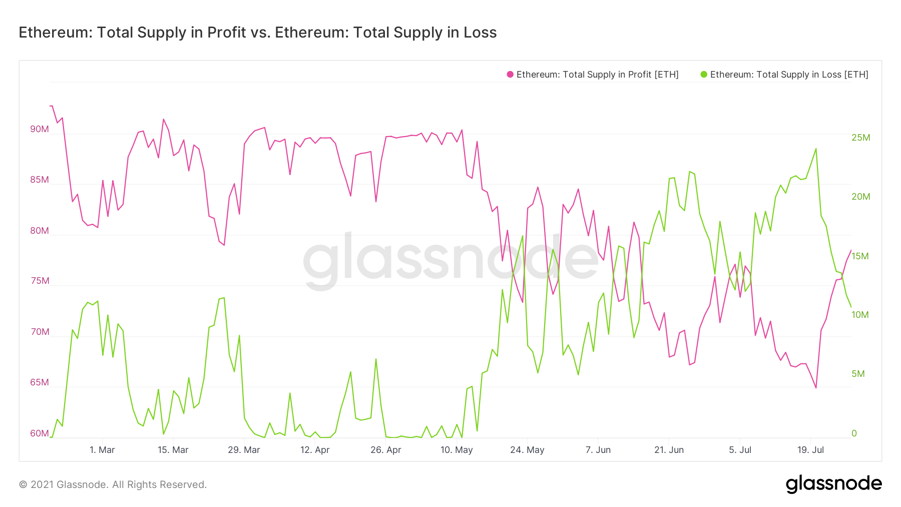 Mặc dù hoạt động sụt giảm, ETH dường như vẫn có nhu cầu theo rất nhiều chỉ số. Thứ nhất, nó vẫn là một tài sản sinh lời. Các khoản lỗ tương đối chưa thực hiện đã thống trị thị trường kể từ đầu tháng 7, nhưng số liệu thay đổi với cuộc biểu tình của tuần này. Hiện tại, lợi nhuận đang tăng và lỗ giảm mạnh là một tín hiệu đáng mừng cho các nhà đầu tư.