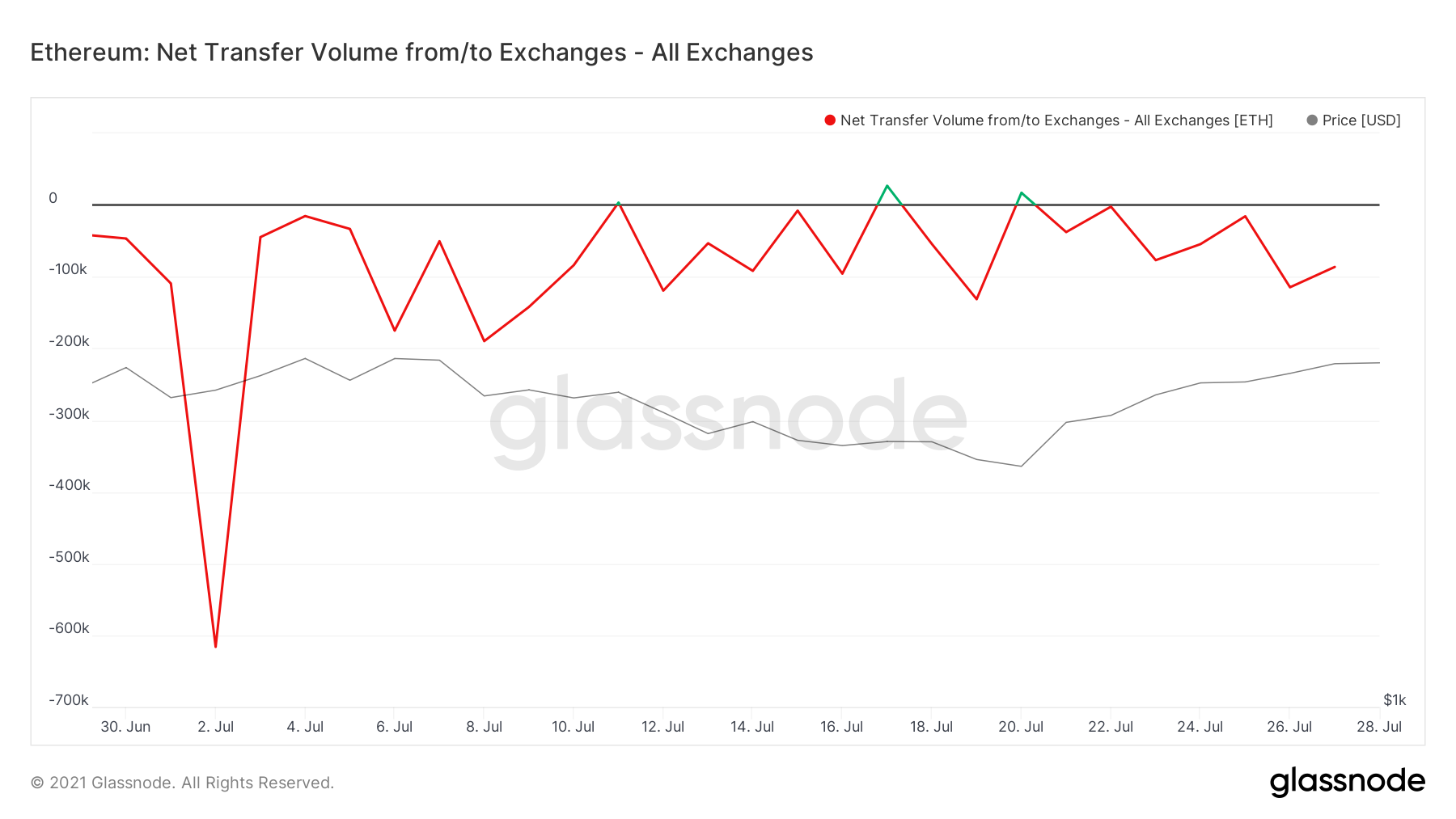 Mặc dù khối lượng giao dịch ngày càng tăng nhưng hoạt động của sàn giao dịch đã không hiển thị bất kỳ sự khác biệt đáng kể nào về dòng chảy ETH vào/ ra khỏi các sàn.