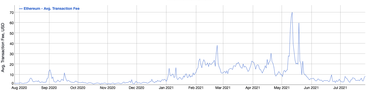 Như có thể thấy từ biểu đồ đính kèm, phí giao dịch của ETH không vượt quá 2 đô la trong hầu hết năm 2020, nhưng đã có một bước ngoặt đáng chú ý ngay khi cuộc biểu tình của Bitcoin tăng tốc vào đầu năm nay. Phí giao dịch của ETH đã tăng lên tới 69,22 đô la vào ngày 12/5, một ngày sau khi ETH đạt ATH 4.164 đô la. Tuy nhiên, tại thời điểm viết bài, phí dao động trong khoảng 3 đô la.