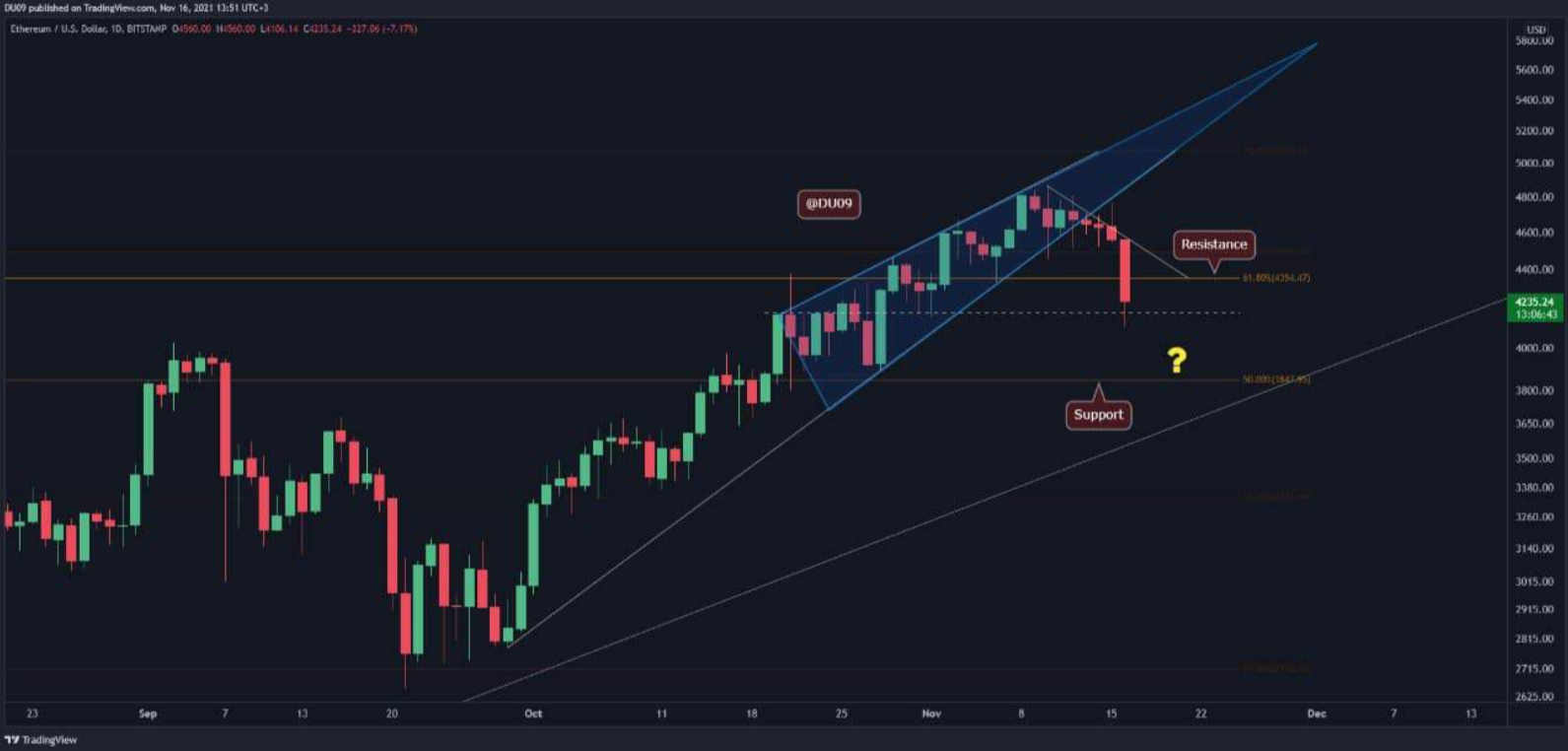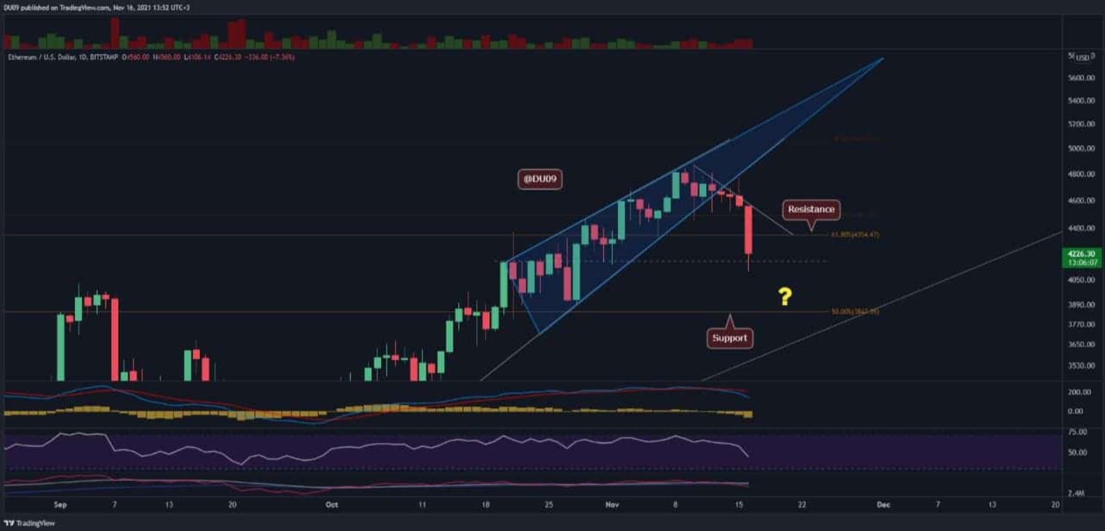 ETH đã phá vỡ xuống dưới mô hình cái nêm tăng dần (đó là sự hình thành giảm giá) và MACD đã tạo ra một bearish cross trong khung thời gian hàng ngày. Hôm nay, những tín hiệu này đã trở thành hiện thực khi giá giảm 10%, đẩy ETH xuống dưới mức hỗ trợ là $ 4.400.
