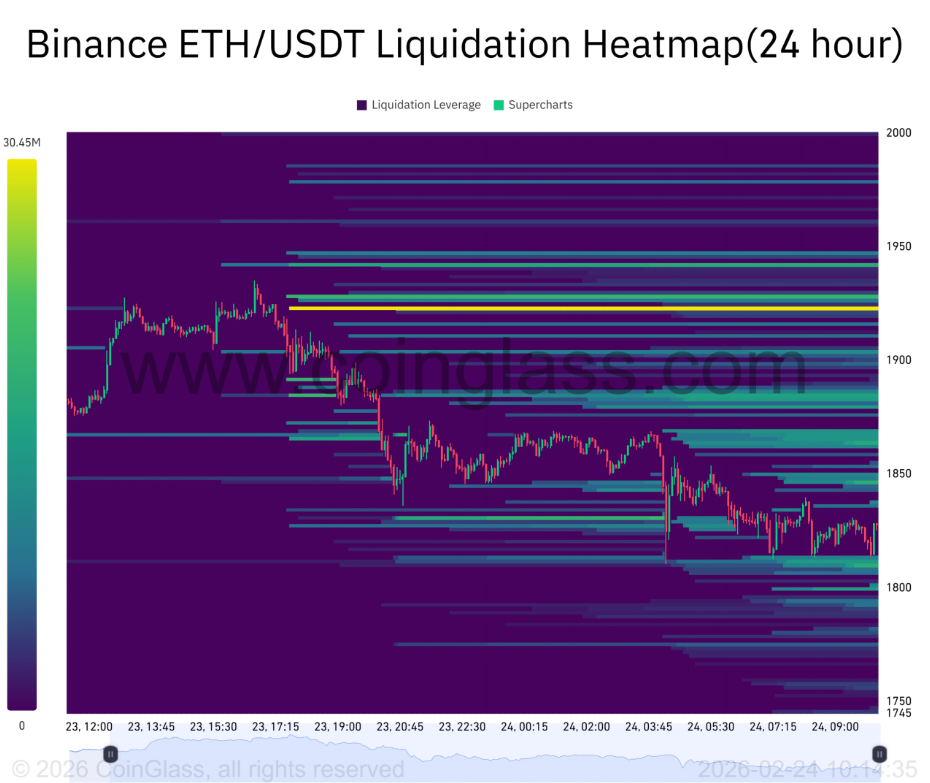 Dữ liệu bản đồ nhiệt thanh lý cặp ETH/USDT trên Binance đang phác họa một bức tranh khá đáng chú ý: một cụm đòn bẩy dày đặc đang tích tụ quanh vùng giá 1.923 USD, với tổng giá trị các vị thế có nguy cơ bị thanh lý lên tới khoảng 30,45 triệu USD.
