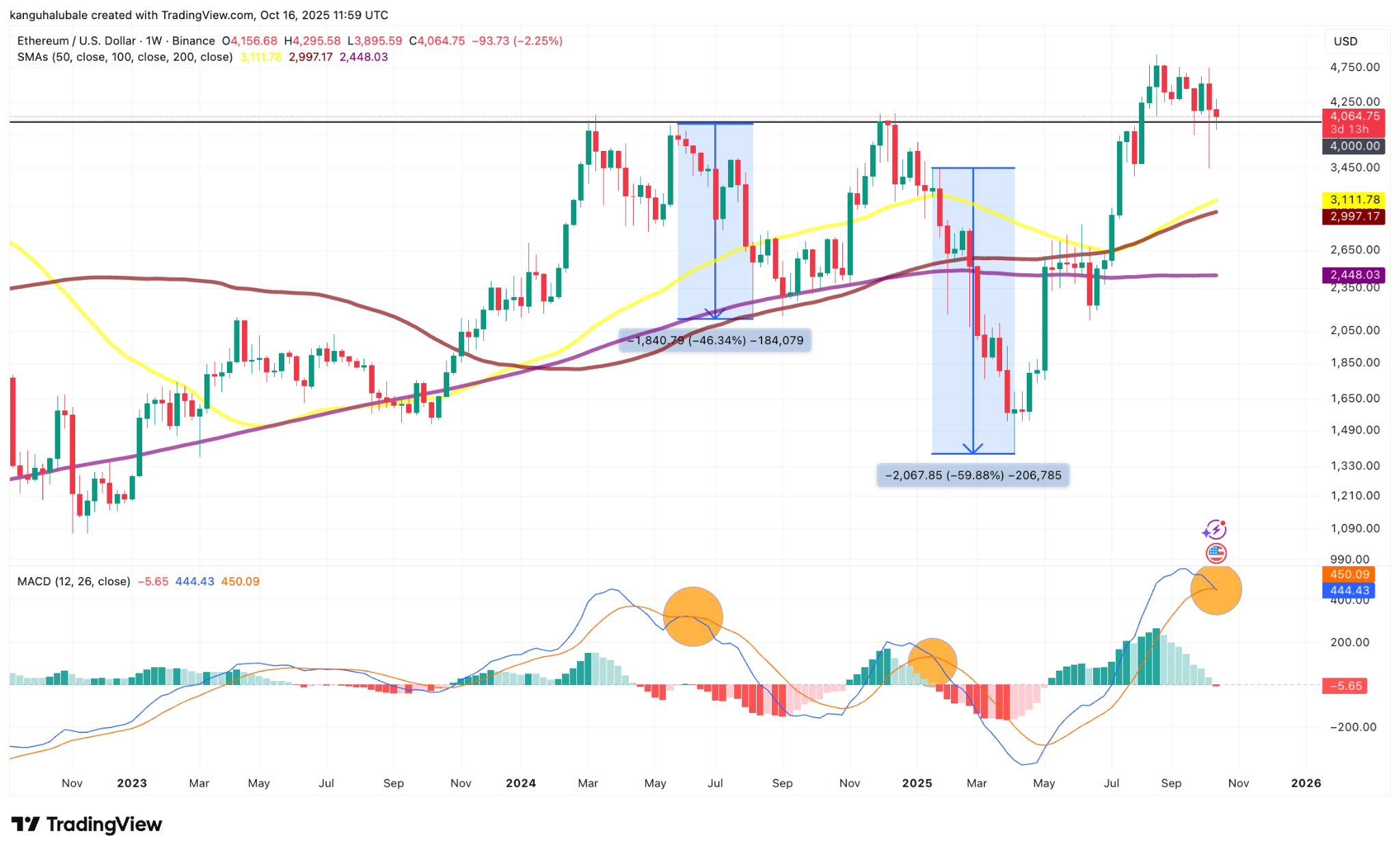Trên biểu đồ tuần, đường MACD của ETH vừa xuất hiện giao cắt giảm (bearish cross), tương tự tín hiệu hồi đầu năm 2025 — giai đoạn mà giá ETH đã giảm hơn 60% chỉ trong vài tuần. Một tín hiệu tương tự vào giữa năm 2024 cũng dẫn đến đợt sụt giảm 46%.