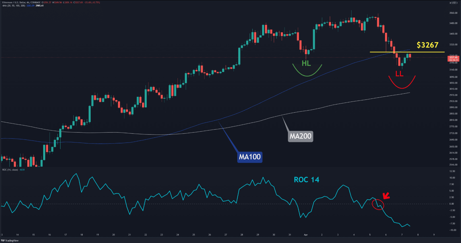 Trong khung thời gian 4 giờ, sự phân kỳ hình thành dưới mức kháng cự chính được đề cập trong phân tích ngày 5 tháng 4 đã khiến giá điều chỉnh và Ethereum giảm xuống dưới MA 100 (màu xanh lam). Tin xấu là ETH đang hình thành một đáy thấp hơn, về mặt kỹ thuật, đây là sự khởi đầu của xu hướng giảm.