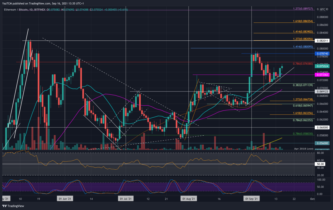 Kể từ đó, ETH cố gắng giữ trên 0,072 BTC và hôm qua đã tăng lên để phá vỡ mức cao nhất của tháng 8 tại 0,0733 BTC một lần nữa và đạt đỉnh 0,076 BTC vào hôm nay.