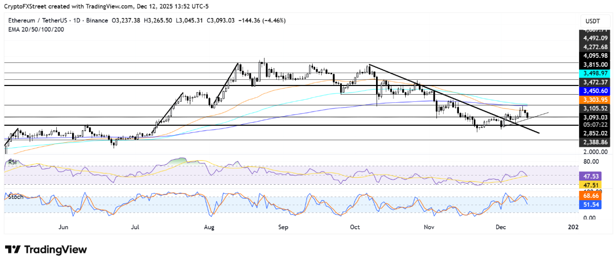 Dự báo giá Ethereum: ETH chững lại tại EMA 50 ngày, đánh mất mốc 3.100 USD