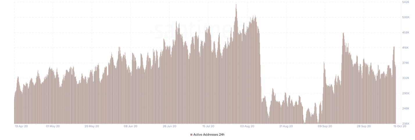 Các tin tức tích cực về testnet dường như đã mang một chút sức sống trở lại với mạng Ethereum. Dữ liệu từ Santiment cho thấy các địa chỉ hoạt động hàng ngày trên Ethereum đang bắt đầu tăng lên sau khi giảm mạnh trong tháng 8 và tháng 9: