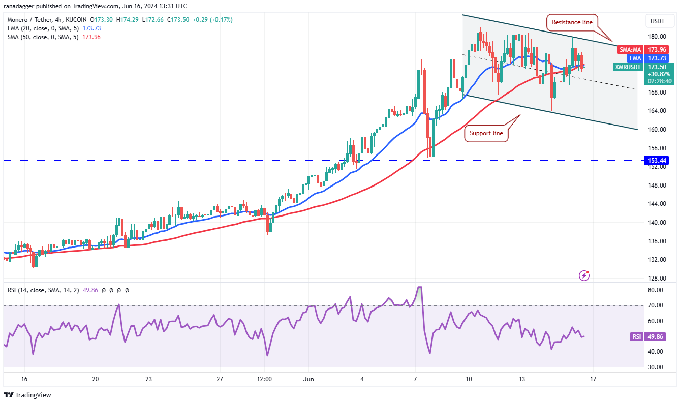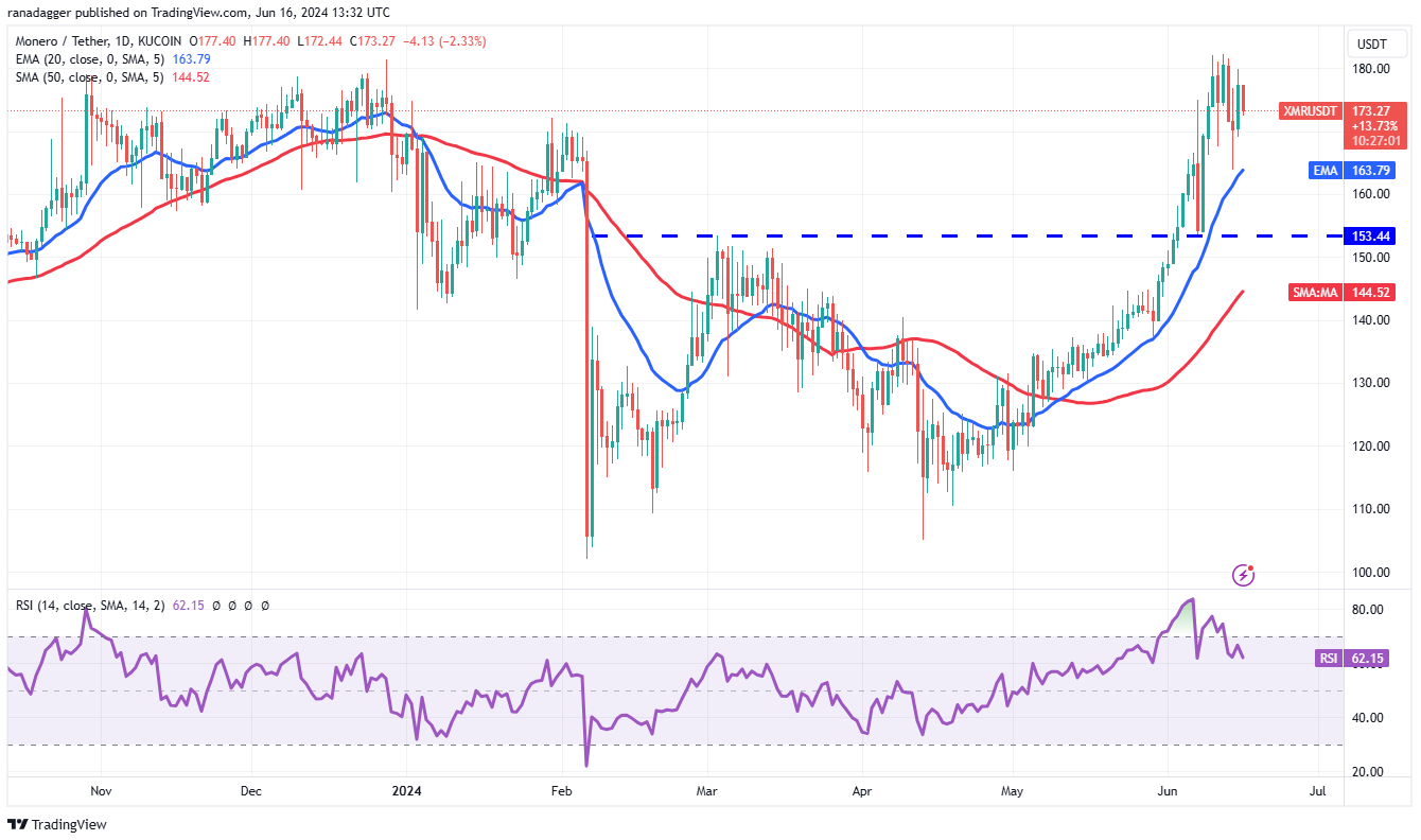 Phe gấu đang cố gắng ngăn chặn đà tăng ở mức $180, nhưng phe bò không cho phép giá giảm xuống dưới đường EMA 20 ngày ($163). Điều này cho thấy phe bò đang mua vào khi giá giảm nhẹ, làm tăng khả năng bứt phá lên trên mức $180. Nếu điều đó xảy ra, cặp XMR/USDT có thể tăng lên ngưỡng kháng cự mạnh trên cao là $190.