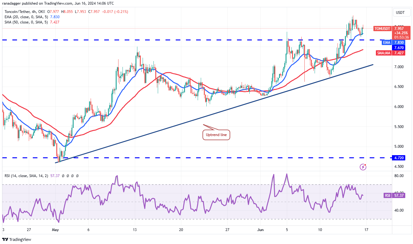 Toncoin (TON) đã hoàn thành mô hình tam giác tăng dần sau khi bứt phá mức $7,67 vào ngày 13 tháng 6. Giá đã giảm từ $8,29 vào ngày 15 tháng 6 để kiểm tra lại mức đột phá là $7,67, có khả năng chứng kiến một cuộc chiến khó khăn giữa phe bò và phe gấu.