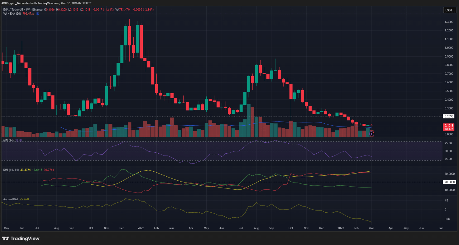 Tại thời điểm viết bài, ENA đã giảm khoảng 15% so với đỉnh cục bộ 0,12 USD. Với những dữ liệu hiện tại, kịch bản giá tiếp tục điều chỉnh sâu hơn vẫn đang được đánh giá là có khả năng cao.