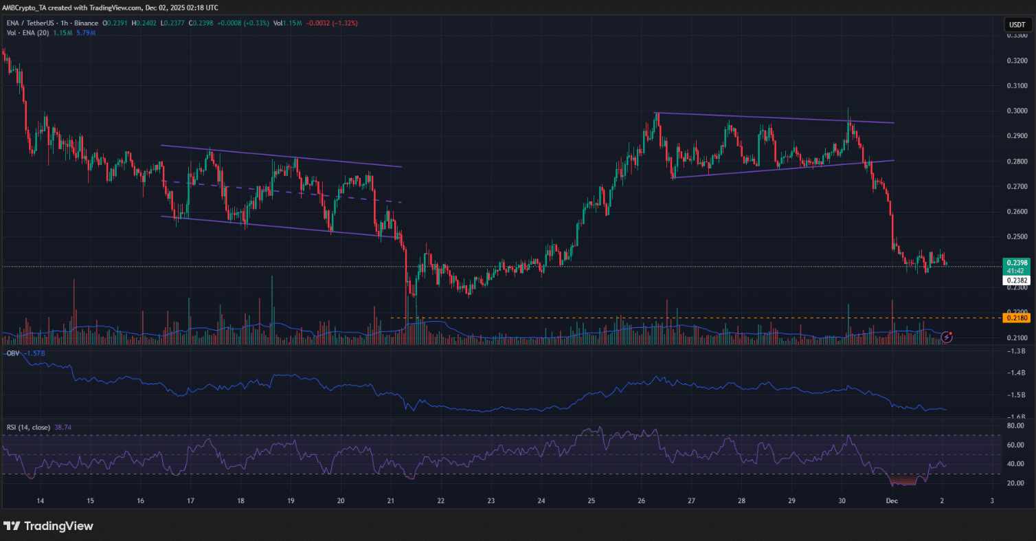 Trên cả khung thời gian hàng ngày và 1 giờ, OBV đang duy trì xu hướng giảm, báo hiệu áp lực bán liên tục. Do đó, bất kỳ đợt tăng giá nào của ENA chỉ nên được coi là cơ hội bán. Chỉ số RSI cũng phản ánh xu hướng giảm mạnh, mà các nhịp hồi ngắn hạn khó có thể phá vỡ.