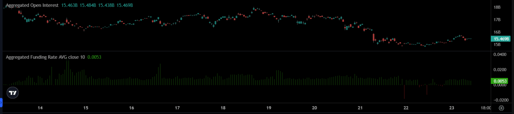 Hợp đồng mở (OI) tổng hợp duy trì quanh 15,46 tỷ USD, chứng tỏ thị trường chưa xuất hiện làn sóng thanh lý mạnh hay áp lực “thoát hàng” ồ ạt. Nếu các trader thực sự hoảng loạn, OI đã giảm sâu, nhưng thực tế lại hoàn toàn trái ngược. Tỷ lệ funding rate hiện chỉ ở mức dương nhẹ 0,0053, cho thấy các trader vẫn nghiêng về vị thế Long, nhưng không quá hung hăng.