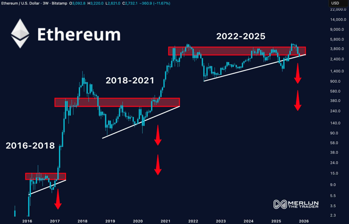 Trong các chu kỳ trước (2016–2018 và 2018–2021), mỗi lần ETH mất ngưỡng này, giá lao dốc nhanh chóng vì gần như không còn hỗ trợ nào phía dưới. Chính vì vậy, các nhà phân tích gọi đây là “vách đá”. Về mặt cấu trúc, nhận định đó hoàn toàn chính xác.