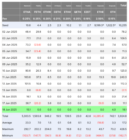 Ether ETF giao ngay đã chứng kiến chuỗi 19 ngày dòng tiền đổ vào trước khi bị gián đoạn vào hôm thứ Sáu, nhưng sau đó đã phục hồi với ba ngày liên tiếp ghi nhận dòng tiền đổ vào mới từ thứ Hai đến thứ Tư, bao gồm hơn 19 triệu USD vào ngày thứ Tư.