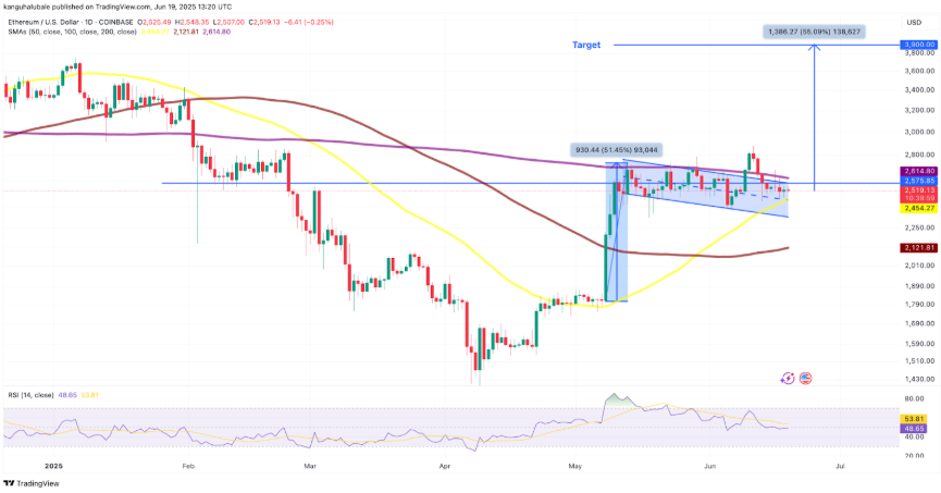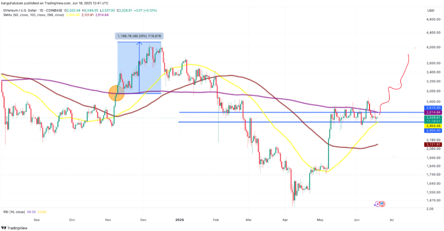 Dữ liệu từ TradingView cho thấy giá ETH bị kẹt giữa hai mức chính: đường trung bình động đơn giản (SMA) 200 ngày quanh $2.600 đóng vai trò là ngưỡng kháng cự và đường SMA 50 ngày ở mức $2.450 đóng vai trò là ngưỡng hỗ trợ.