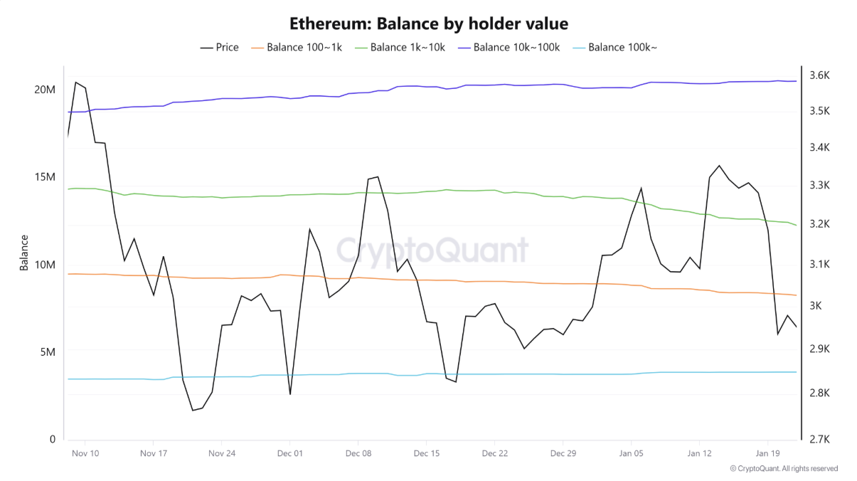 Tình hình tương tự cũng diễn ra ở các nhà đầu tư cá nhân nắm giữ 100–1.000 ETH và 1.000–10.000 ETH, với hoạt động bán kéo dài từ tháng 12, tổng cộng 520.000 ETH đã được phân phối kể từ Chủ nhật. Trong khi đó, cá voi (ví nắm giữ 10.000–100.000 ETH) vẫn duy trì hoạt động tích trữ, nhưng lượng mua ròng trong giai đoạn gần đây tương đối trung lập, chỉ phần nào giảm bớt áp lực bán.