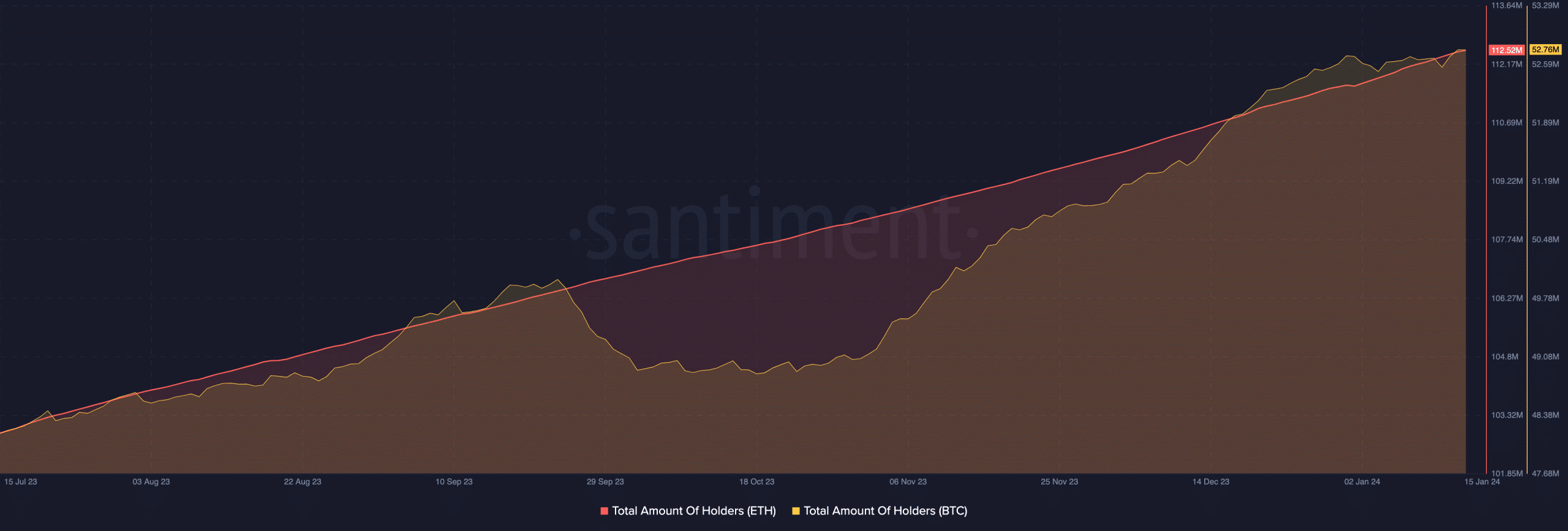 Về số lượng holder, Santiment cho thấy BTC có 52,76 triệu. Mặt khác, ETH có giá trị cao hơn gấp đôi ở mức 112,52 triệu.
