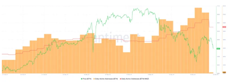 Từ ngày 22/2 đến ngày 11/3, giá ETH tăng đáng kể 36,52%, với số địa chỉ hoạt động hàng ngày đồng thời tăng từ 449.000 lên 545.000, đánh dấu giai đoạn tăng trưởng mạnh mẽ và tương tác trong mạng Ethereum. Tuy nhiên, xu hướng này đã thay đổi gần đây khi giá ETH trải qua một đợt điều chỉnh từ khoảng 4.000 vào ngày 13/3 xuống 3.400 đô la vào ngày 21/3.