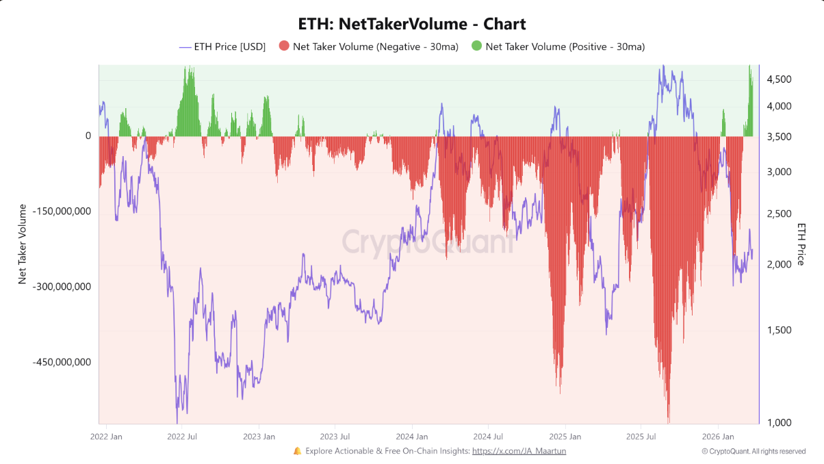 Ở chiều ngược lại, nhóm nhà đầu tư nhỏ lẻ – vốn đã liên tục bán ra trong nhiều tuần – gần như không ghi nhận biến động đáng kể về số dư trong tuần vừa qua. Đồng thời, lực mua chủ động trên thị trường phái sinh đang chiếm ưu thế khi Net Taker Volume của hợp đồng tương lai ETH đạt +133 triệu USD trong vài ngày gần đây.