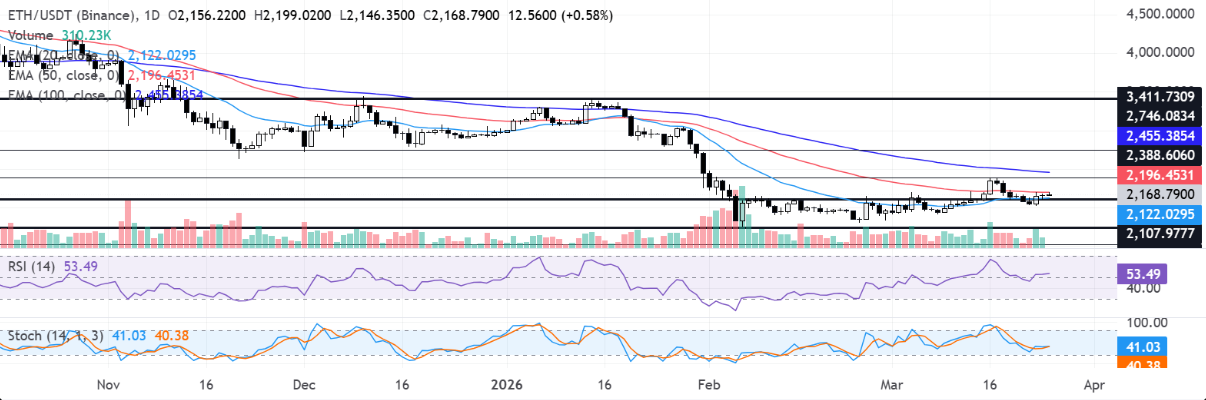 Trên khung thời gian ngày, ETH hiện giao dịch quanh 2.160 USD. Xu hướng ngắn hạn đang nghiêng nhẹ về phía tăng khi giá duy trì trên đường EMA 20 ngày (khoảng 2.120 USD) và dần tách khỏi vùng tích lũy trước đó quanh 2.050 USD.