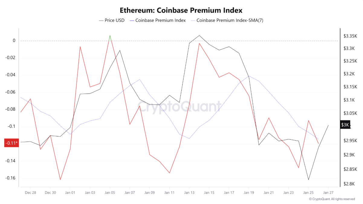 Dù dòng vốn quay lại các ETF ETH, sự quan tâm từ nhà đầu tư Mỹ vẫn ở mức hạn chế. Chỉ số Coinbase Premium, phản ánh tâm lý nhà đầu tư Mỹ, duy trì vùng âm trong tuần qua, cho thấy xu hướng “giảm rủi ro” vẫn chiếm ưu thế.