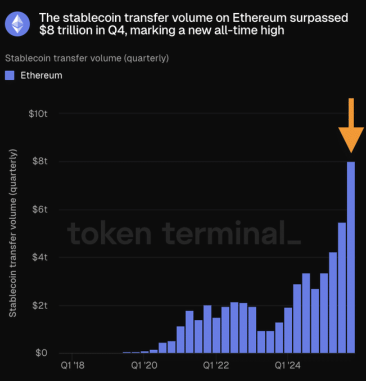 Song hành với đó, mức độ hoạt động trên mạng lưới cũng tăng vọt. Thống kê của Token Terminal ghi nhận khối lượng chuyển stablecoin trên Ethereum trong quý IV/2025 đã vượt mốc 8.000 tỷ USD, thiết lập kỷ lục ATH mới.