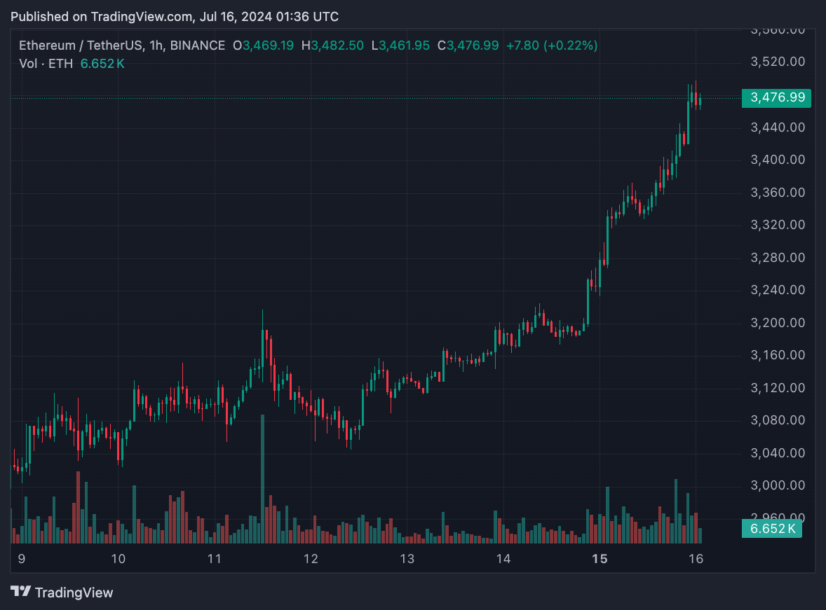 Vào thời điểm viết bài, giá ETH đang tăng 6% sau khi quá trình phê duyệt Ethereum ETF có những chuyển biến tích cực, giao dịch ở mức 3.468 USD, nâng tổng lợi nhuận bảy ngày qua lên 14,6%.