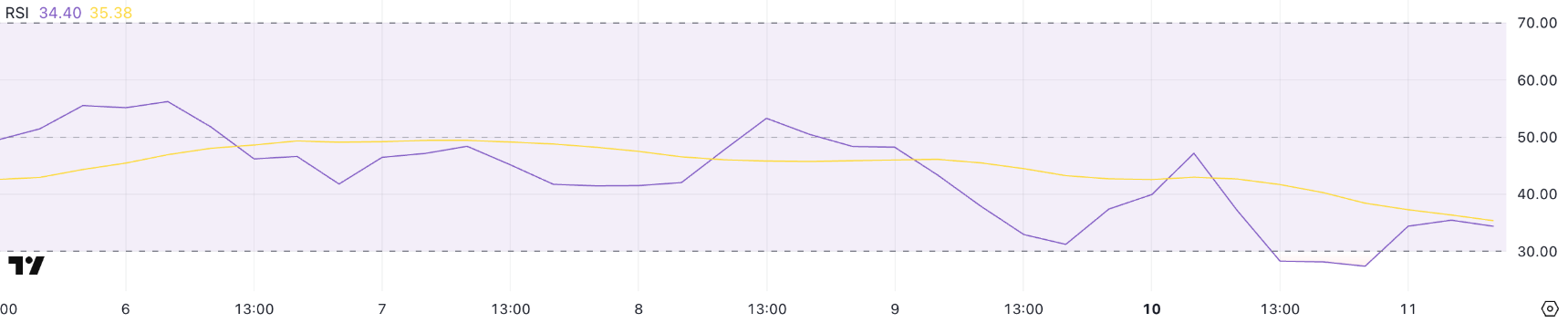 Chỉ số sức mạnh tương đối (RSI) của Ethereum hiện đang ở mức 34,4, hồi phục nhẹ sau khi chạm đáy 27,4 vào ngày hôm qua. RSI đã duy trì dưới ngưỡng 50 trong ba ngày liên tiếp, cho thấy xu hướng giảm vẫn đang thống trị.