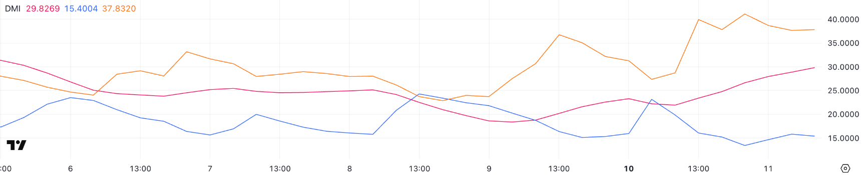 Biểu đồ Chỉ số chuyển động định hướng (DMI) của Ethereum cho thấy Chỉ số định hướng trung bình (ADX) hiện đang ở mức 29,82, tăng từ 21,9 vào ngày hôm qua.
