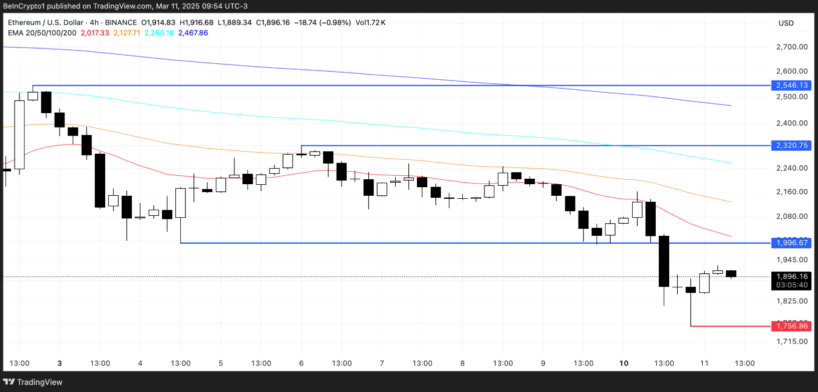 Sự sắp xếp này xác nhận đà giảm vẫn tiếp diễn, khi ETH đã giảm hơn 11% trong 24 giờ qua. Nếu xu hướng hiện tại tiếp tục, ETH có thể kiểm tra mức hỗ trợ quan trọng tại $1.756, một ngưỡng có thể quyết định liệu ETH có tiếp tục giảm sâu hơn hay không.