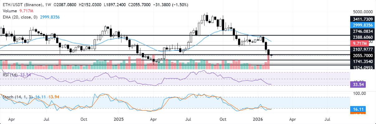 Trên khung thời gian tuần, cặp ETH/USDT hiện dao động quanh vùng 2.055 USD. Giá vẫn nằm khá xa bên dưới đường trung bình động hàm mũ (EMA) 20 tuần tại 2.999 USD — một ngưỡng đang dốc xuống rõ rệt và đóng vai trò như rào cản mạnh đối với mọi nỗ lực phục hồi. Việc duy trì khoảng cách lớn so với EMA cho thấy xu hướng giảm vẫn đang áp đảo. Chỉ khi xuất hiện một cây nến đóng cửa tuần vượt trở lại trên đường trung bình này, áp lực bán mới có thể được xoa dịu phần nào.