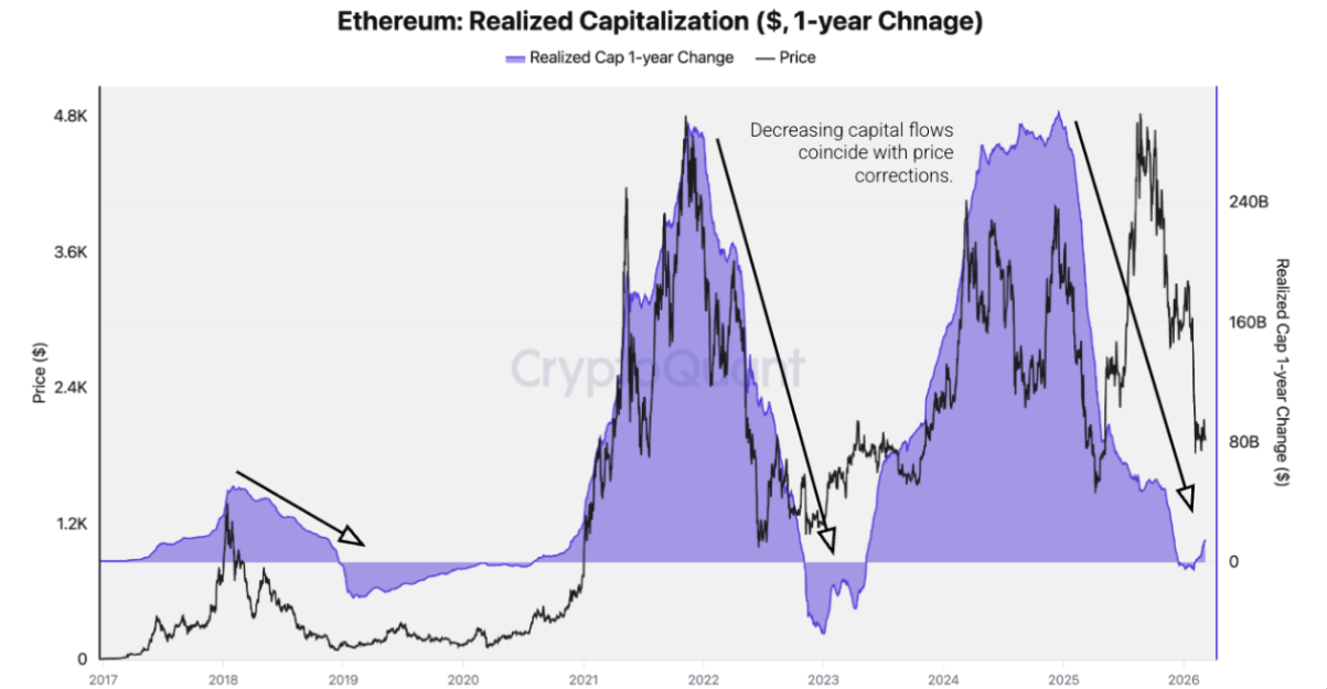 “Trong các chu kỳ trước, đặc biệt giai đoạn 2017–2018 và 2021, sự gia tăng mạnh của vốn hóa thực thường đi kèm với các đợt tăng giá lớn của ETH, phản ánh dòng vốn mới đổ vào mạng lưới. Ngược lại, khi chỉ số này chuyển sang âm – như năm 2019 hay trong thị trường gấu 2022–2023 – giá ETH thường bước vào giai đoạn suy giảm mạnh.”