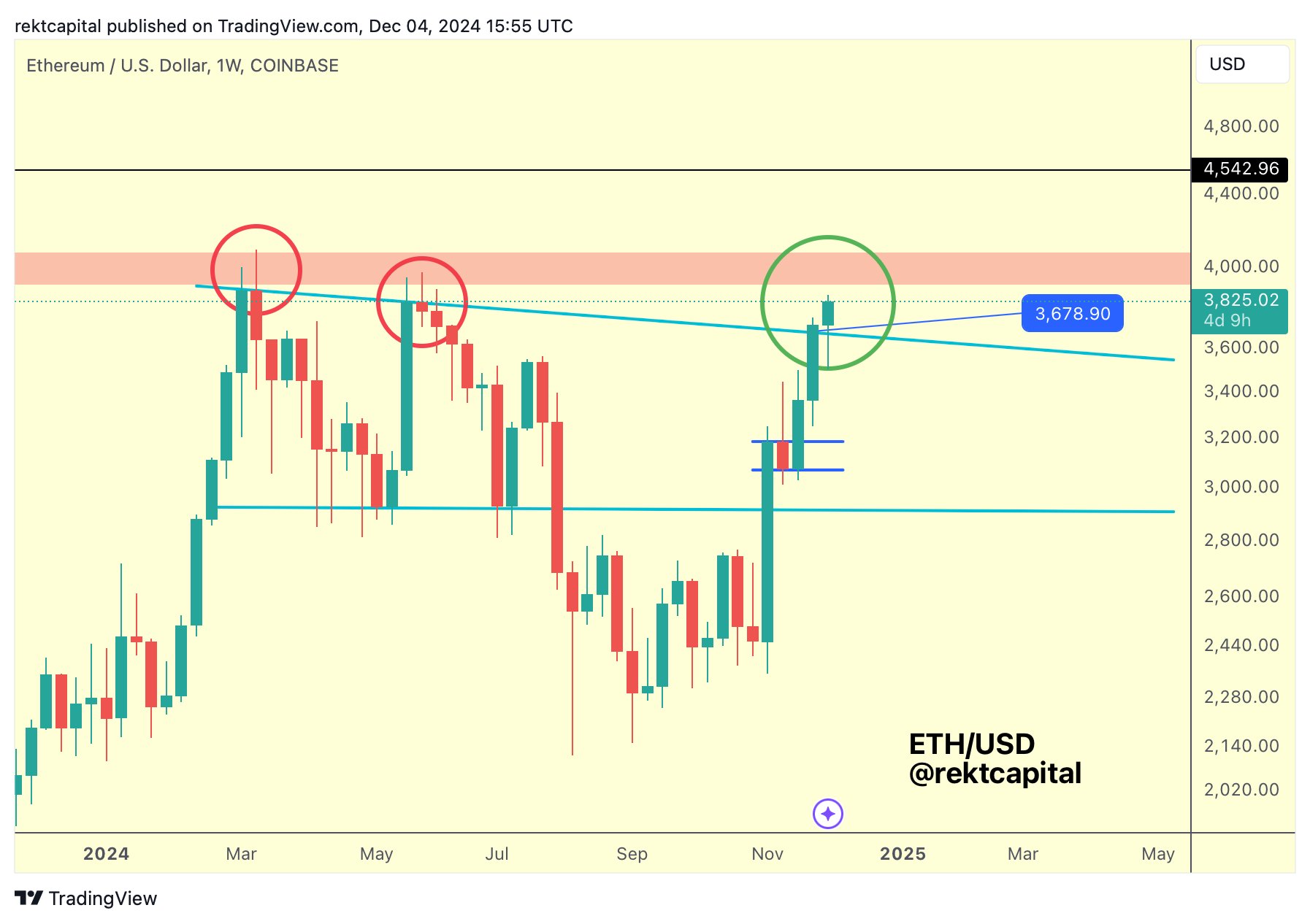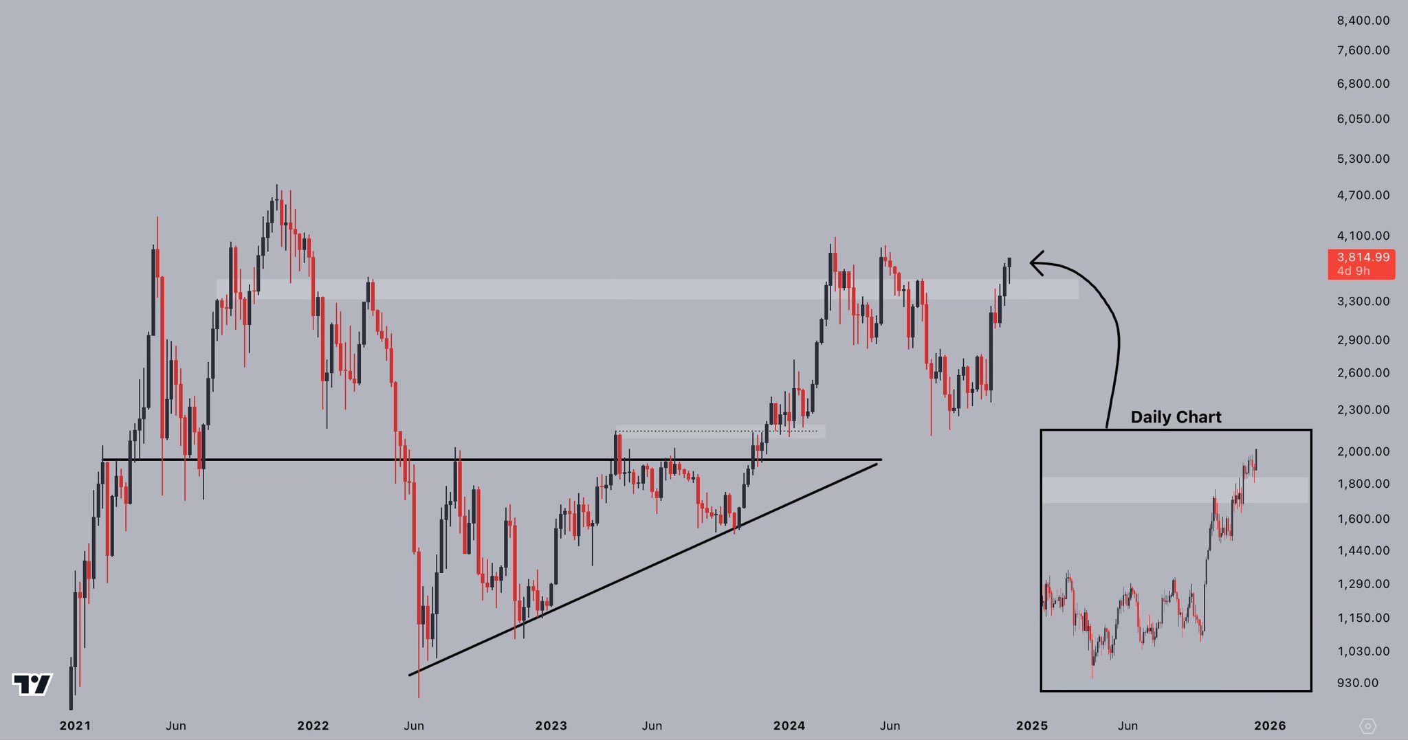 Trên nhiều khung thời gian, Jelle đã nhấn mạnh một sự thay đổi quan trọng giữa kháng cự và hỗ trợ, điều này có thể đưa ETH/USD lên mức 5.000 USD, một mốc tâm lý quan trọng.