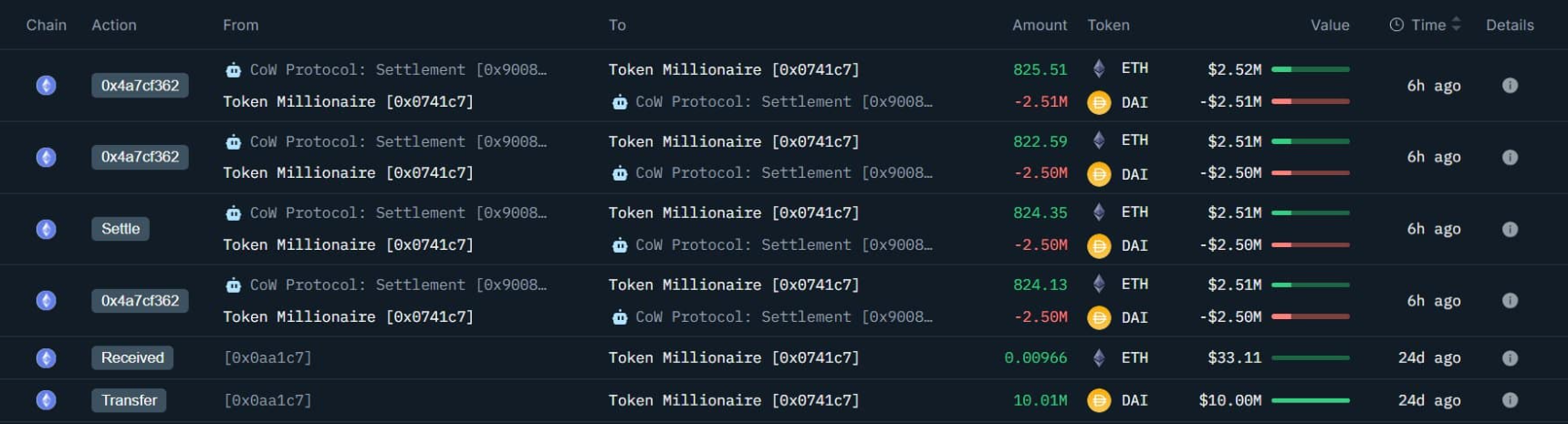 Trong số đó, một cá voi nổi bật đã chuyển 10 triệu USD stablecoin DAI để mua Ethereum, đánh dấu sự trở lại sau thời gian rút vốn, cho thấy niềm tin mạnh mẽ vào tiềm năng tăng giá của tài sản này.