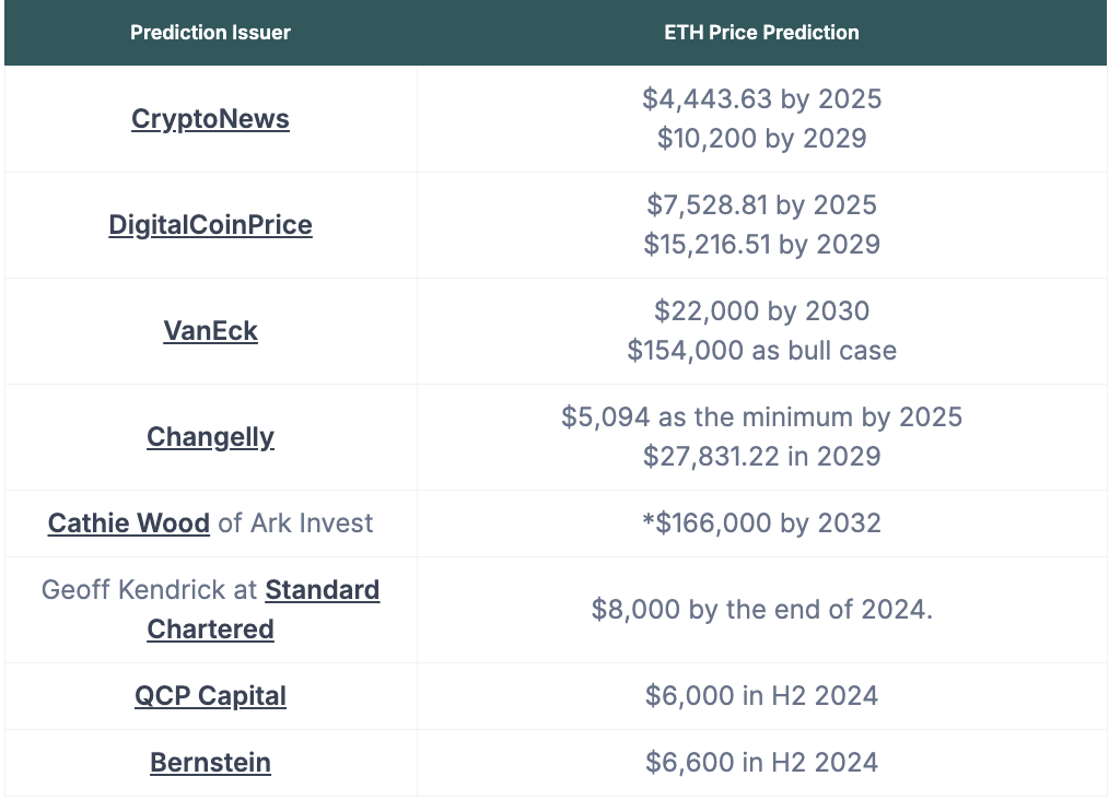 Bernstein, QCP Capital và Standard Chartered đưa ra triển vọng ngắn hạn, dự đoán giá ETH trong khoảng từ 6.000 đến 8.000 đô la vào năm 2024. CryptoNews đưa ra ước tính thận trọng nhất ở mức 4.443 đô la, trong khi Cathie Wood của Ark Invest đưa ra dự báo lạc quan nhất ở mức 166.000 đô la.