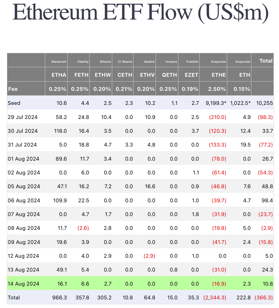 Trong khi đó, các quỹ Ethereum ETF được giao dịch tại Hoa Kỳ đã ghi nhận dòng vốn vào trong ngày thứ ba liên tiếp với 10,8 triệu đô la được ghi nhận vào ngày 14 tháng 8.