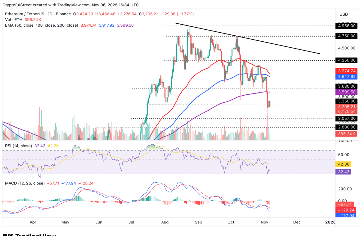 Ethereum hiện đang giao dịch dưới ngưỡng 3.300 USD, chịu áp lực mạnh mẽ từ tâm lý bi quan bao trùm toàn thị trường tiền điện tử. Trên khung thời gian ngày, phe gấu tiếp tục chiếm ưu thế khi chỉ số sức mạnh tương đối (RSI) giảm về mức 32 — tiến sát vùng quá bán, cho thấy đà suy yếu đang gia tăng.