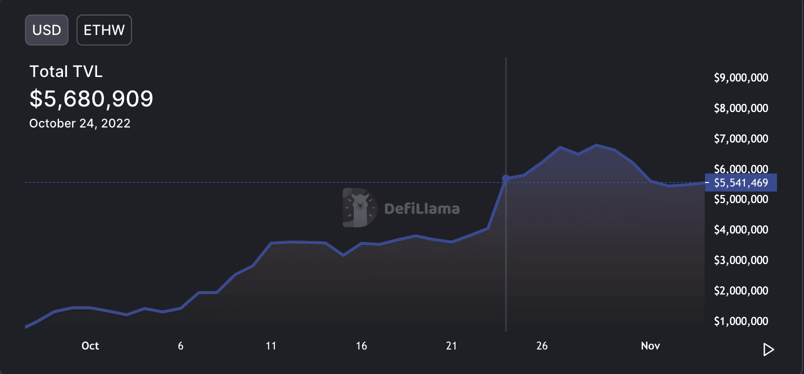 Theo DefiLlama, 15 giao thức DeFi được đặt trong mạng PoW có TVL là 5,54 triệu đô la tại thời điểm viết bài. Tính đến đầu tháng 10, TVL trên EthereumPoW ở mức 1,42 triệu đô la. Tuy nhiên, khi nhiều giao thức DeFi được tung ra trên chain trong khoảng thời gian 31 ngày qua, TVL của nó tăng 365% và kết thúc tháng lên đến 6,6 triệu đô la.