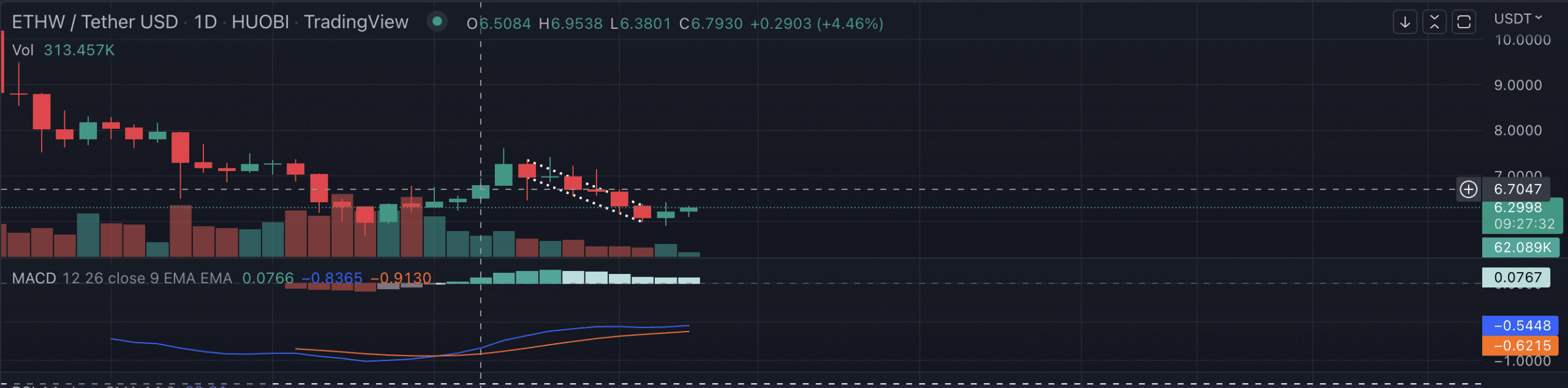 Đối với token gốc ETHW, giá đã giảm 95% kể từ khi ra mắt. Xếp thứ 68 với vốn hóa thị trường là 691 triệu đô la, ETHW hiện giao dịch ở mức 6,5 đô la.