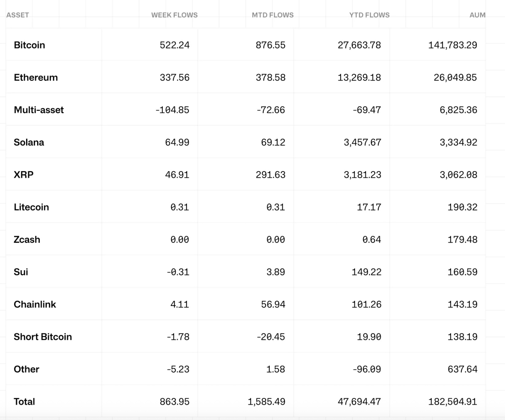 Các ETP dựa trên BTC tiếp tục dẫn đầu về dòng vốn theo tài sản cơ sở, với 522 triệu USD được bổ sung trong tuần qua. Qua đó, tổng dòng vốn lũy kế từ đầu năm quay trở lại mức 27,7 tỷ USD, dù vẫn thấp hơn đáng kể so với con số 41,6 tỷ USD của năm 2024.